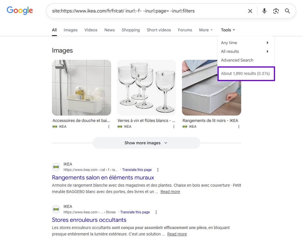 Sauf qu’IKEA, a choisi de jouer la carte de la sobriété — moins de 2 000 pages de facettes dans l’index Google :