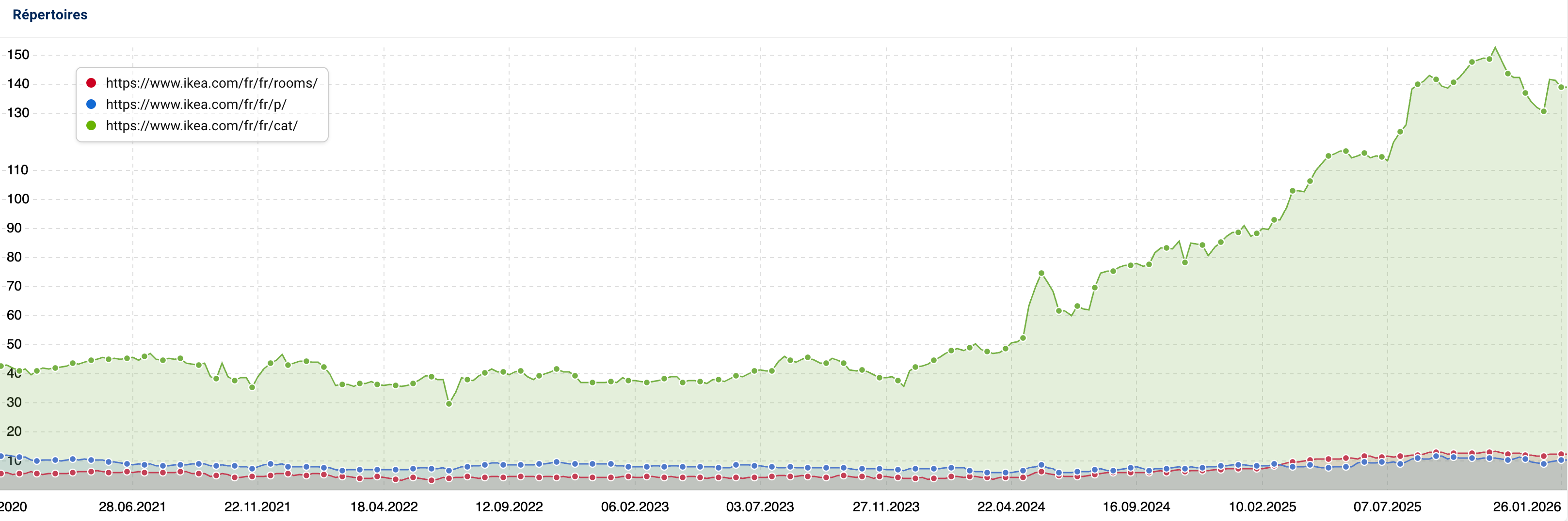 Si on découpe la visibilité par catégorie de pages, on s’apercevra que les pages de produits et de listes de produits restent stables depuis les dernières années.