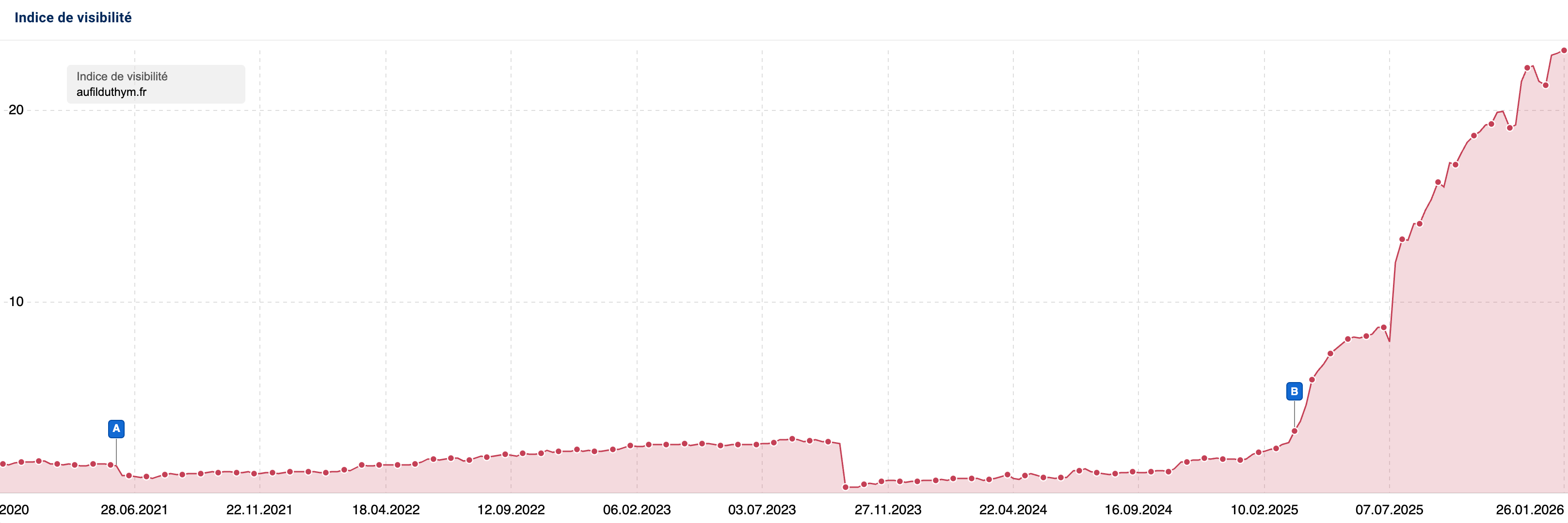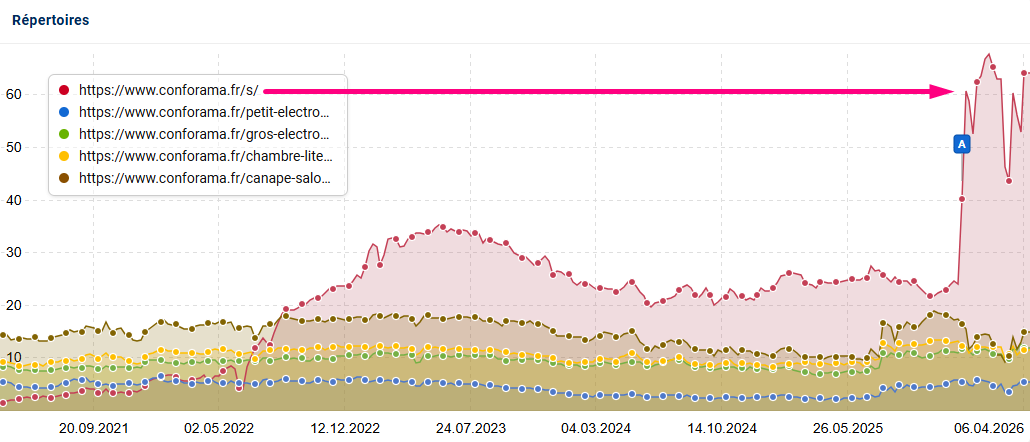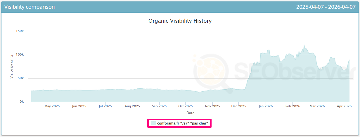 Que ce succès soit lié la Core Update du décembre (qui débute à la même période) ou à des optimisations spécifiques, le fait est là : le dispositif porte ses fruits et Conforama entre en 2026 avec une croissance de +64% de visibilité et cette croissance se poursuit en 2026 :