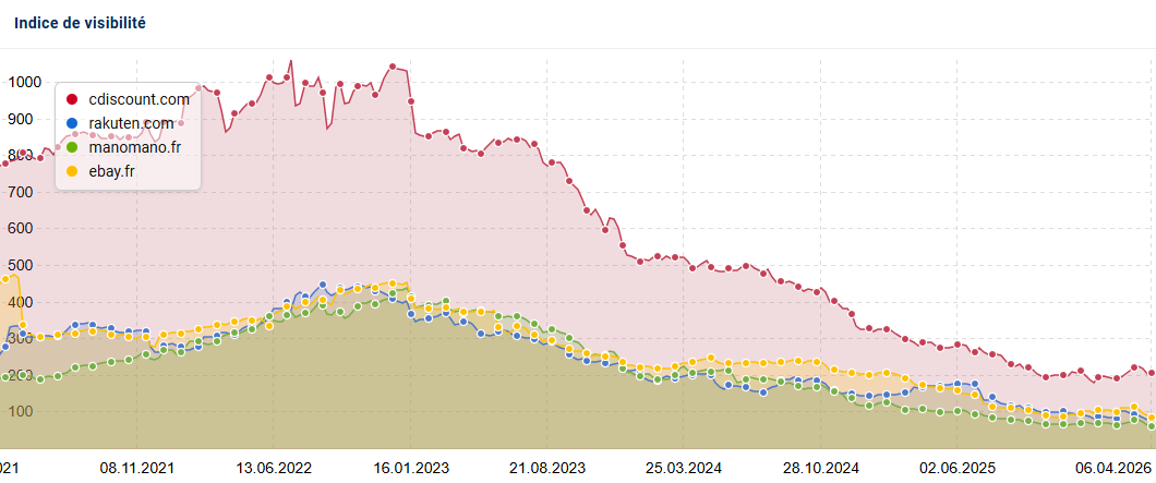 Quand on fait un exercice de croiser les visibilités de Cdiscount, Rakuten, Manomano et Ebay, on constatera chez tout le monde la même baisse “orchestrée”.